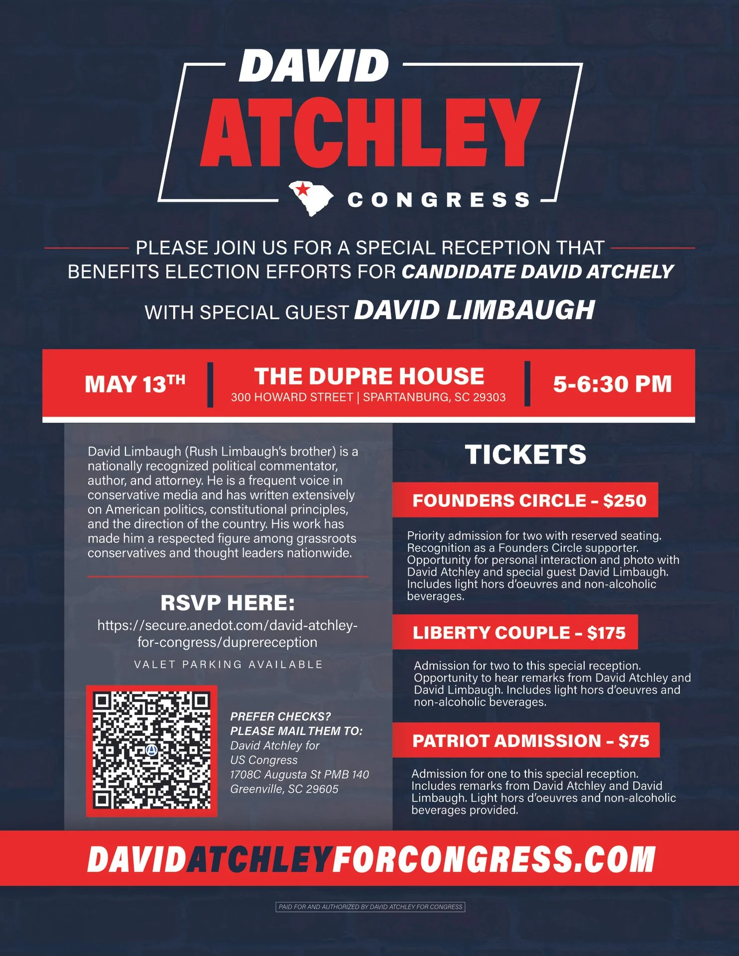 May 13 | Spartanburg Reception with David Limbaugh Wednesday, May 13, 2026 5:00 PM 6:30 PM The Dupre House (VCOM) 300 Howard Street Spartanburg, SC 29303 (map) Google Calendar ICS RSVP Here: https://secure.anedot.com/david-atchley-for-congress/duprereception